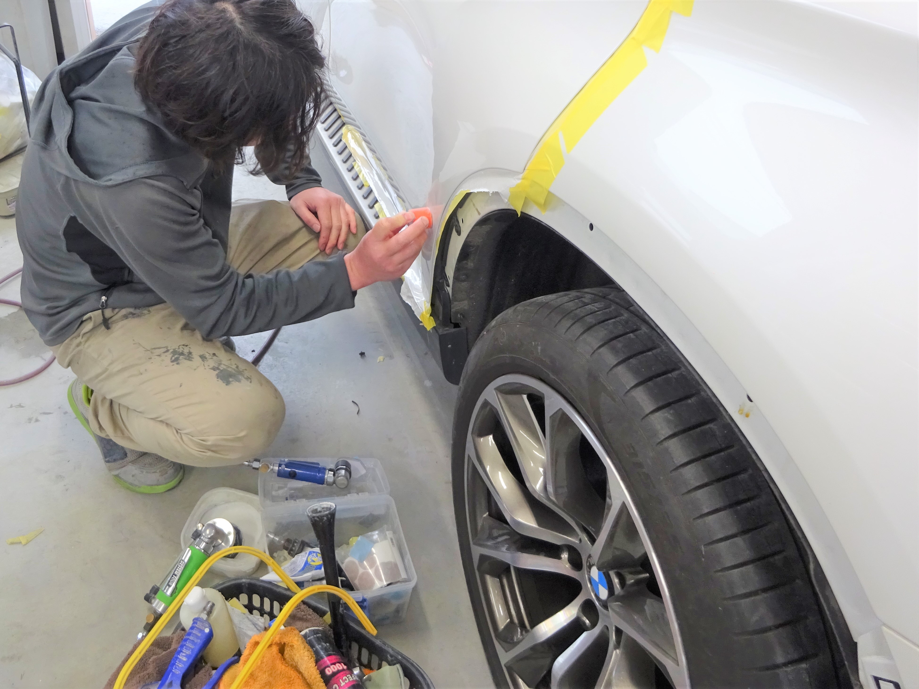 引き出し作業後、鉄板のわずかな凹凸を補正する為に、パテを使い表面を仕上げます。
